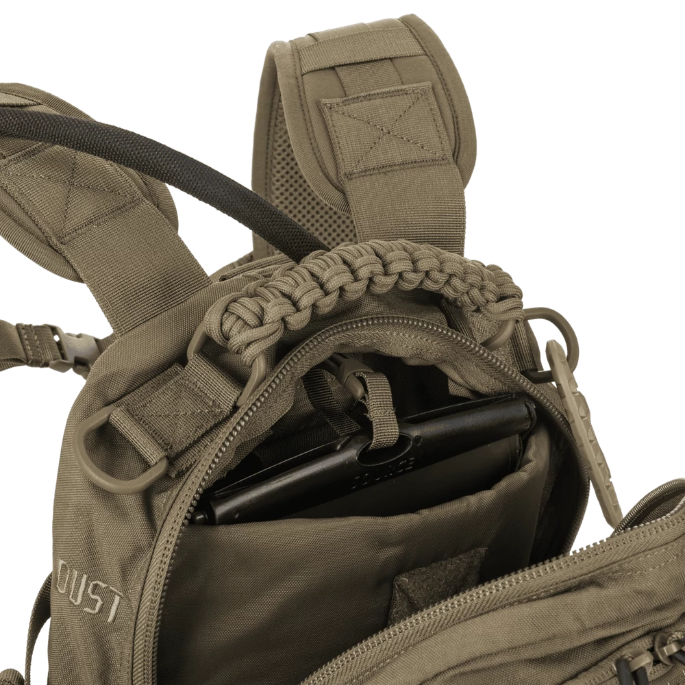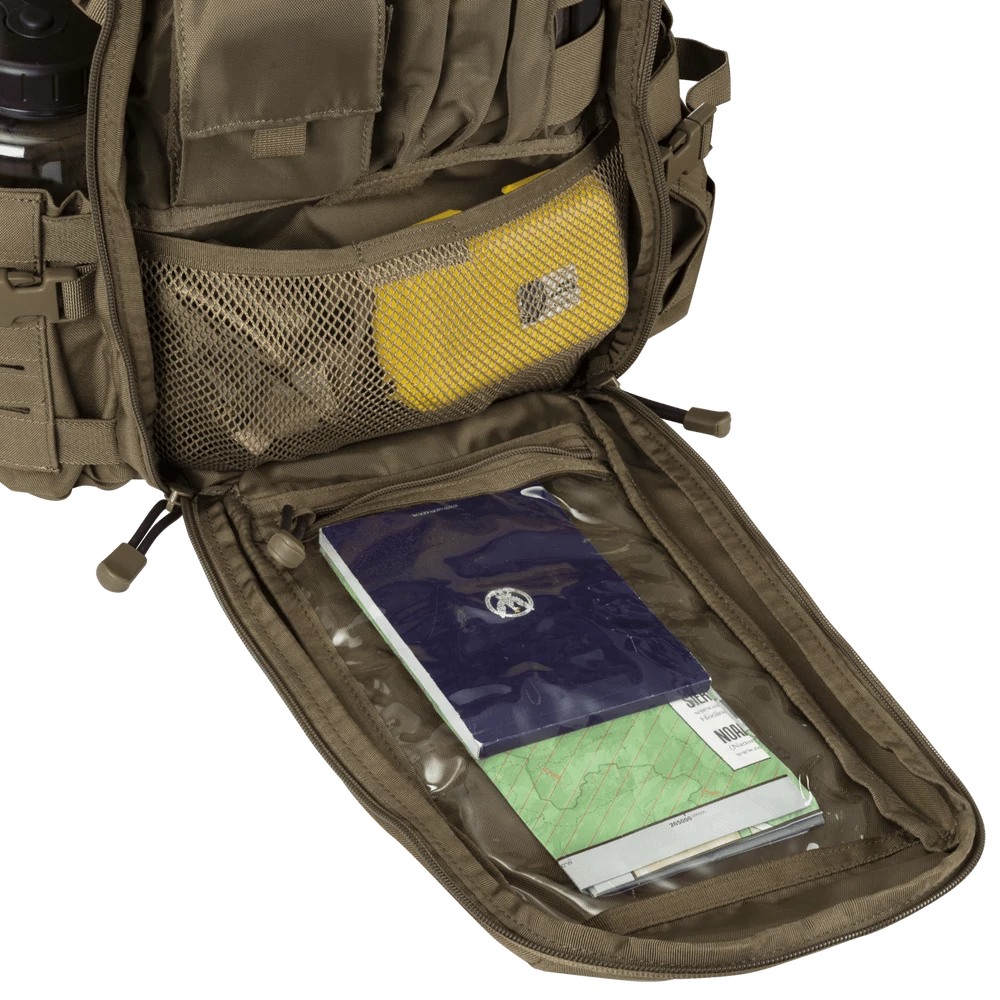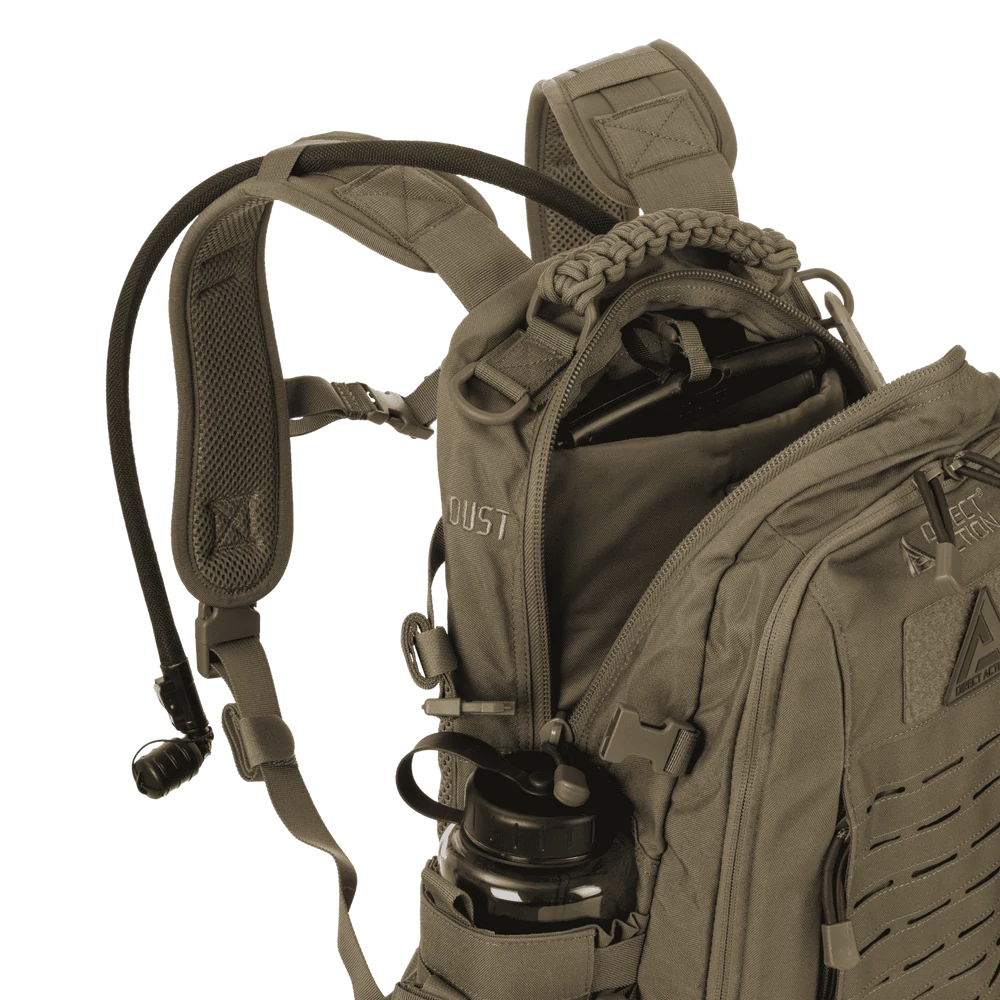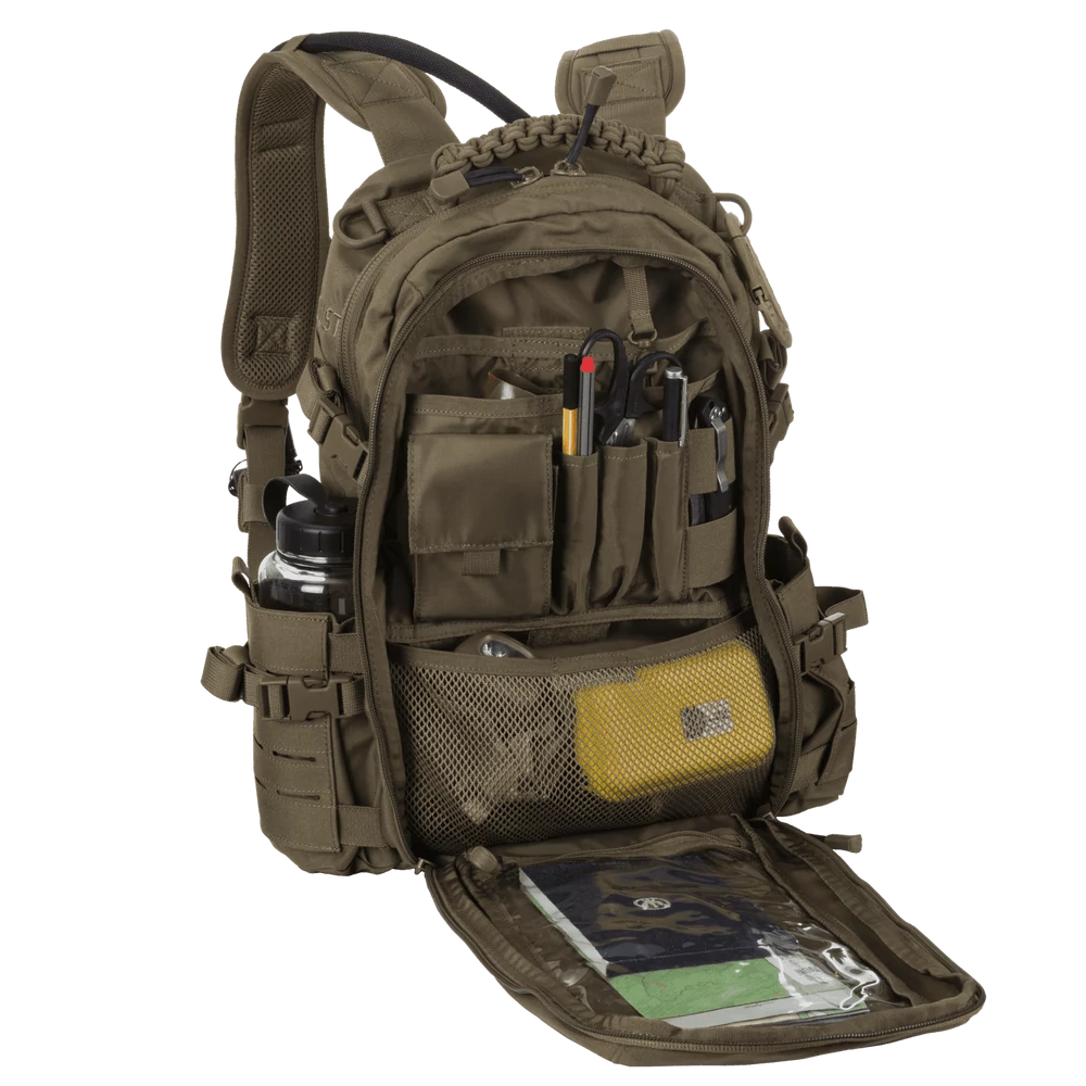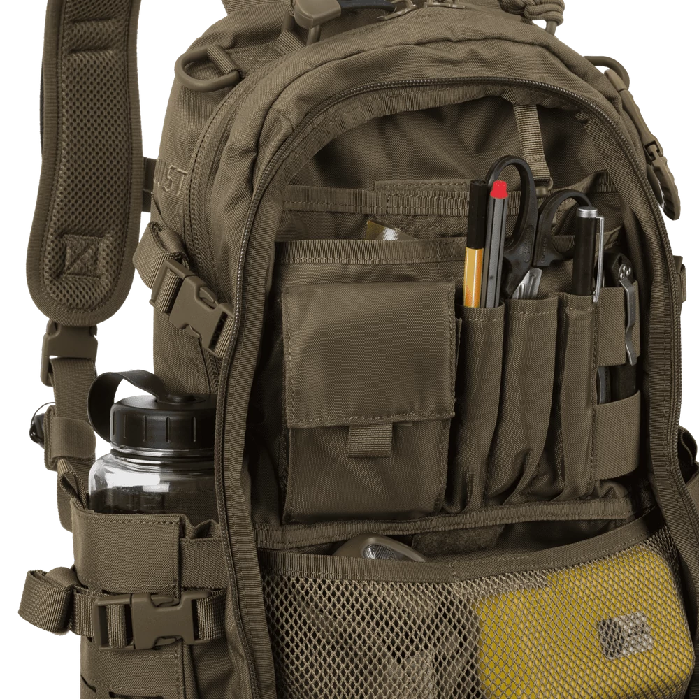 A Direct Action® DUST® MkII BACKPACK - Cordura® - Olive Green - Taktikai Hátizsák (Olive Green) egy kicsi, 20+ literes hátizsák, amely EDC/egynapos zsákként használható. Két cipzáras rekesszel rendelkezik, a főrekeszben egy belső, párnázott laptop/hidratáló rekesz és egy hálós kiegészítő zseb található. A kisebb rekeszben egy belső rendszerező található a jegyzettömbök, GPS, íróeszközök és egyéb dolgok számára, valamint egy átlátszó műanyag zseb a térképek és dokumentumok számára.