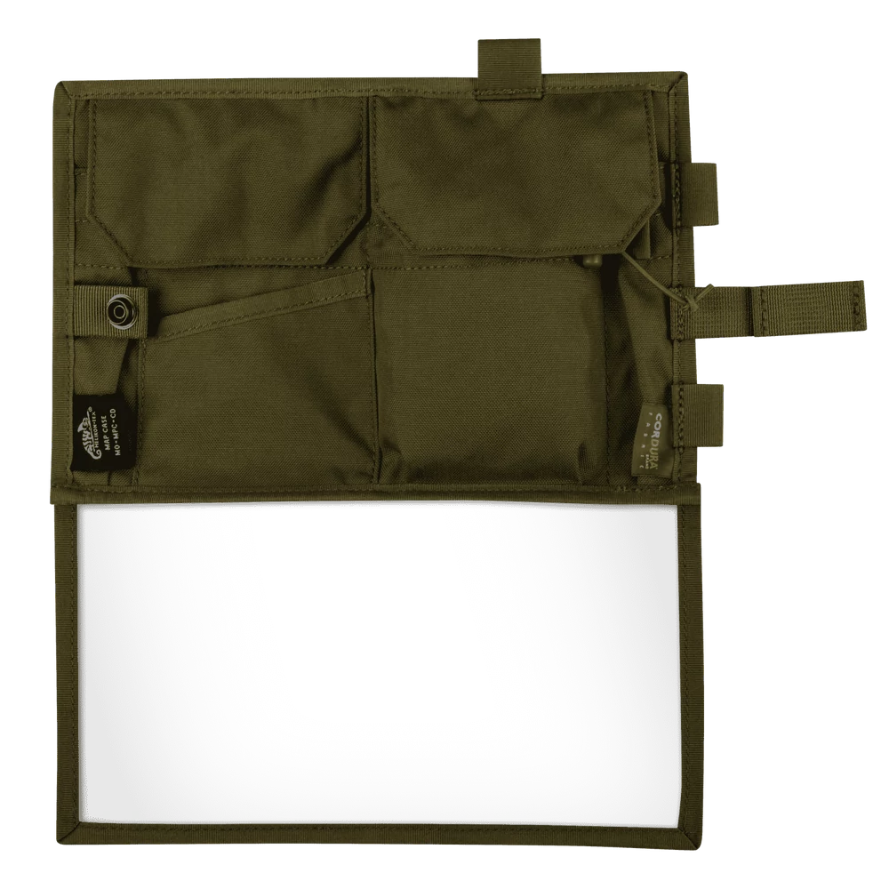 A Helikon-Tex® - Map Case - Cordura® - Térképtartó (Olive Green) egy kompakt tasak, amely lehetővé teszi, hogy térképét egy átlátszó, cipzáros belső zsebben vigye, és minden időjárási körülmény között megóvja azt. A tasak tartós, 500D Cordura® anyagból készült. Kívül két patentos gombokkal záródó zseb és két nyitott, kisebb zseb található. Ezenkívül az oldalán hurkok találhatók tollnak és egyéb kiegészítőknek. Használaton kívül a Map Case félbehajtható és pattintógombbal rögzíthető.